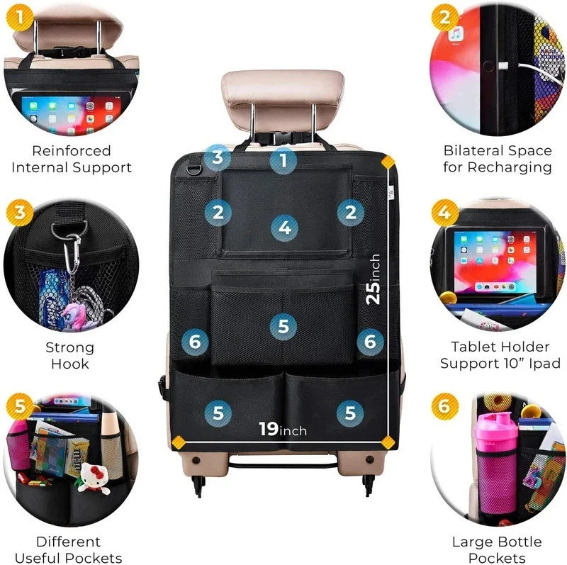 - Our car back seat organizer with a clear tablet holder will make your kids engaged and happy, because we use custom-made material to easily touch the screen.