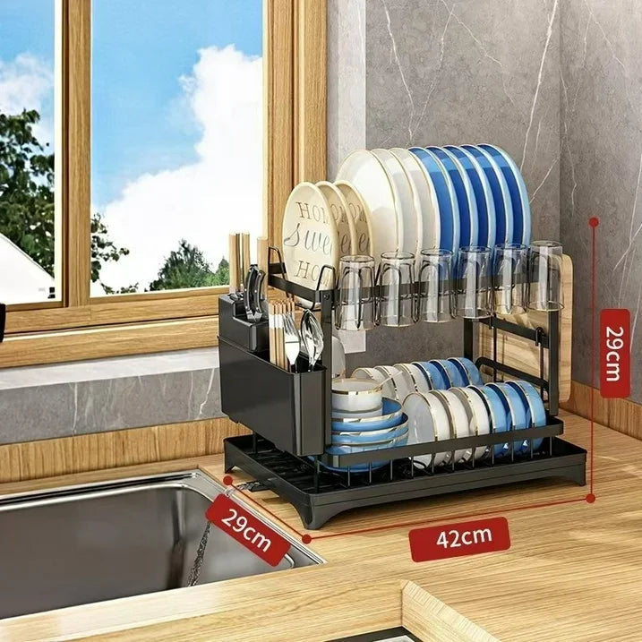 - With a practical 2-tier design and a size of 16.5*11.8*11.4 inch, This dish drainer for kitchen counter enables you to store different types and sizes of kitchenware, such as bowls, dishes, knives, wine glasses, kitchen pots, and frying pans. This 2-tier dish drying rack is perfect for families of 3-4 persons.