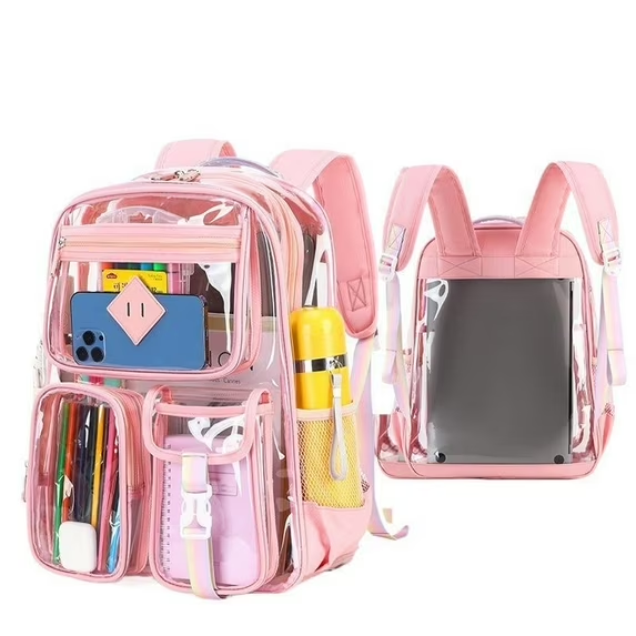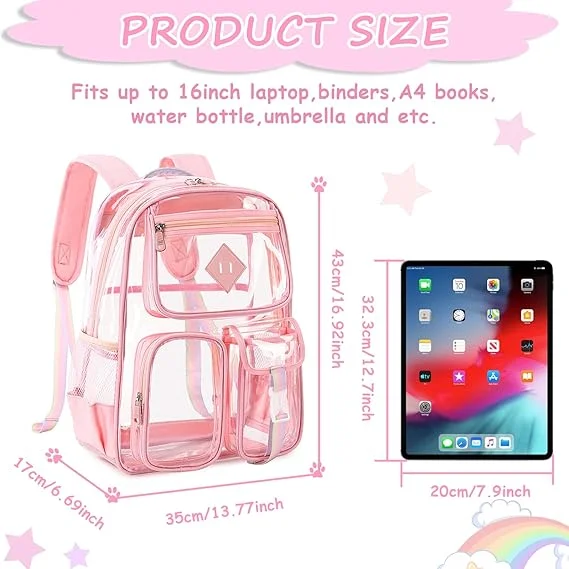 - Made of water resistant thickened 0.5mm PVC, anti-yellow stain and cold-resistant, sturdy plastic tube and reinforced stitching of the girls clear backpack could keep its straight shape and bear more weight.