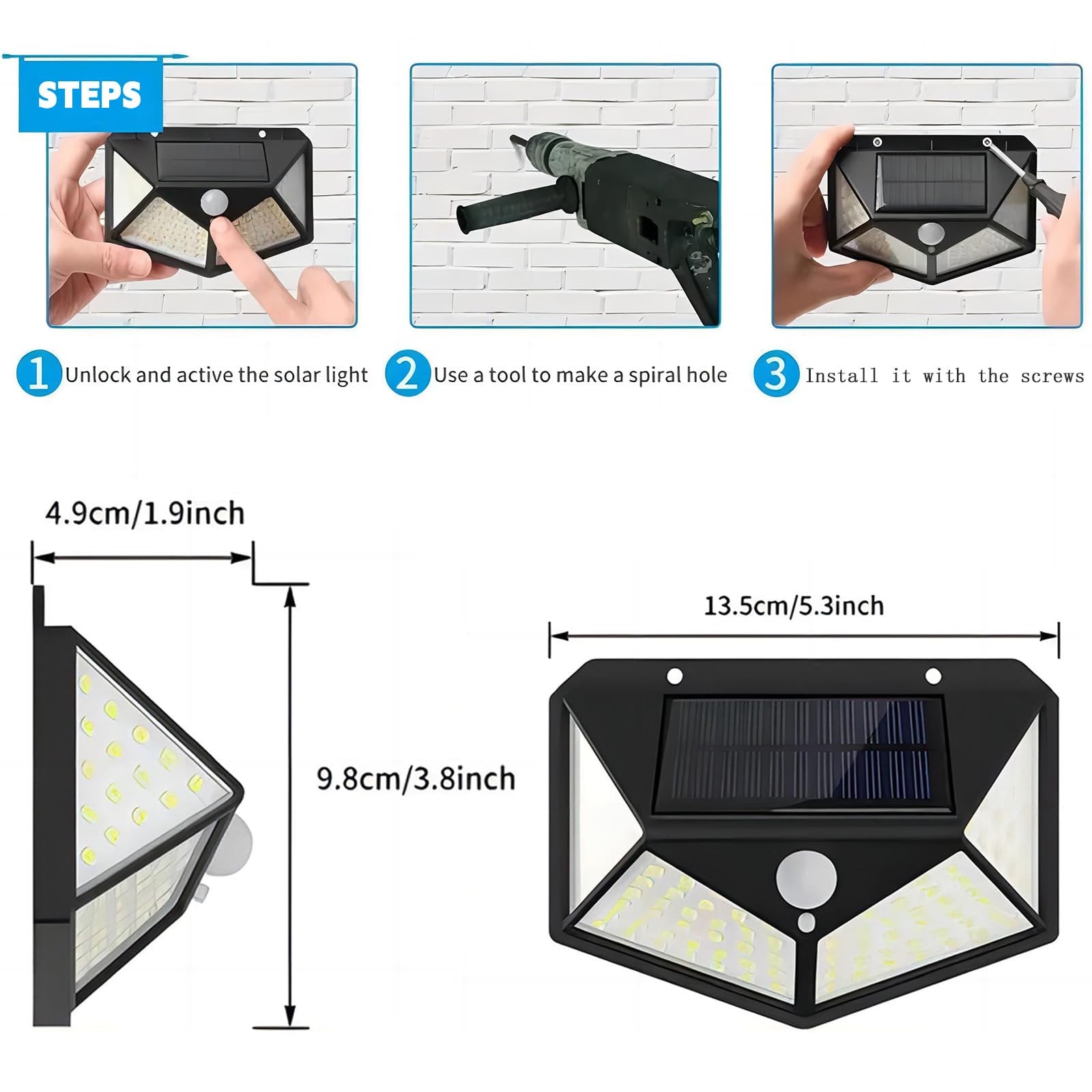 This solar-powered wall lamp features 100 LED lights with human body induction capabilities, designed to enhance garden ambiance. Waterproof and versatile, it offers three adjustable lighting modes, providing energy-efficient illumination and charming outdoor decoration without the need for electrical wiring. Perfect for pathways, gardens, and outdoor spaces.
