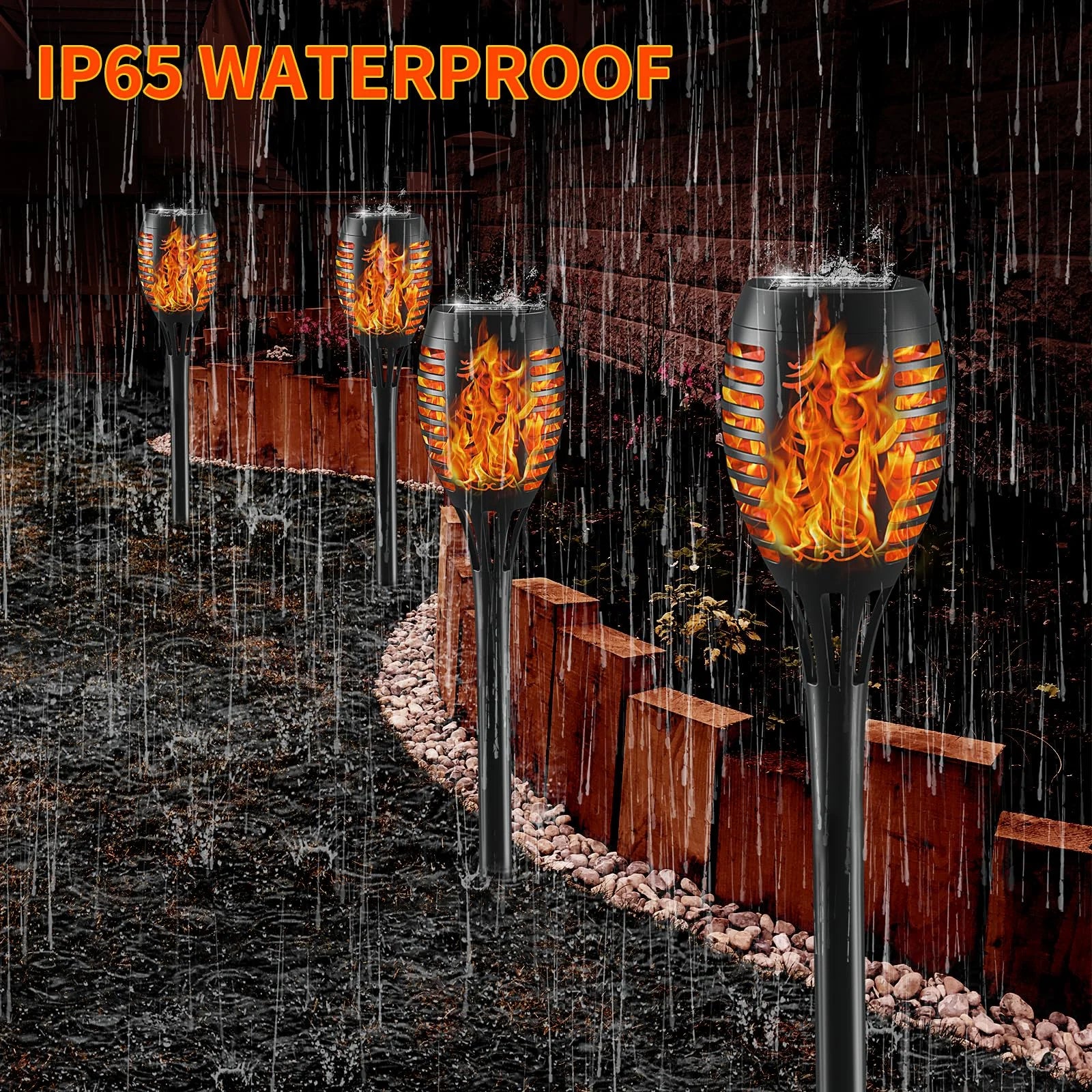 - IP65 Waterproof outdoor Solar lights: solar flame lights are made of durable ABS material and can withstand all kinds of weather all year round, including heavy rain and snow. You can put solar flame lights on your lawn, garden, patio, yard, and path