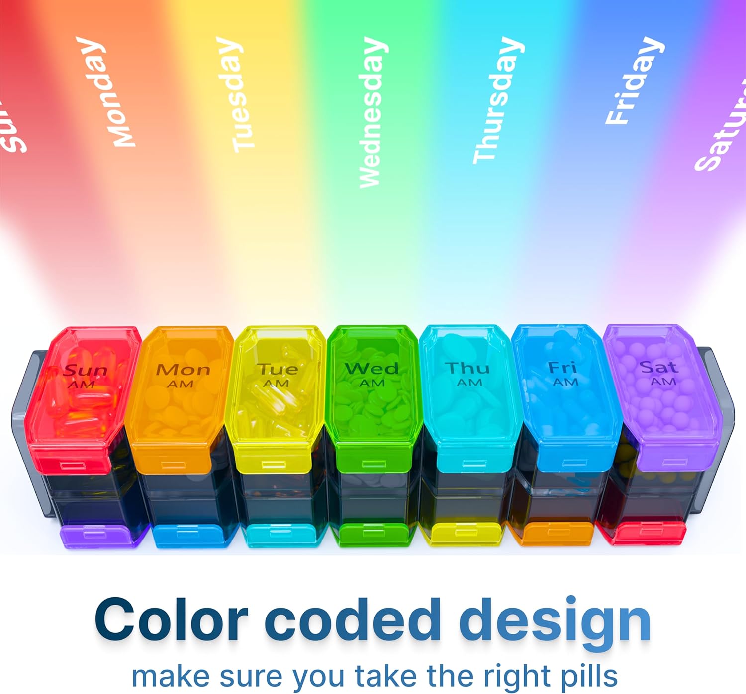 - The twice a day medicine container is marked with a rainbow system, making it simple to arrange medications for the week. Each section is color-coded for easy recognition and includes large, legible labels.