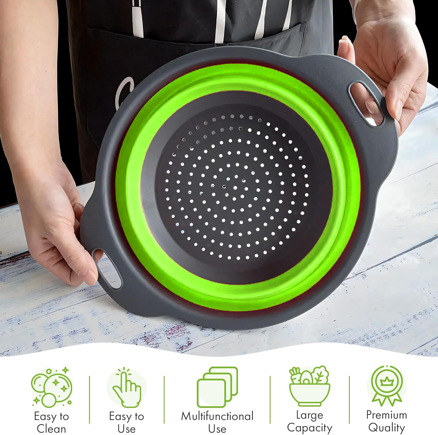- Our collapsible strainers are designed for convenience and efficiency, perfect for everyday kitchen tasks such as rinsing vegetables, draining pasta, and more. The collapsible colander with handles ensures a secure and comfortable grip, making it easier to strain even heavier foods without slipping. Plus, its foldable design allows for easy storage when not in use, saving precious kitchen space.