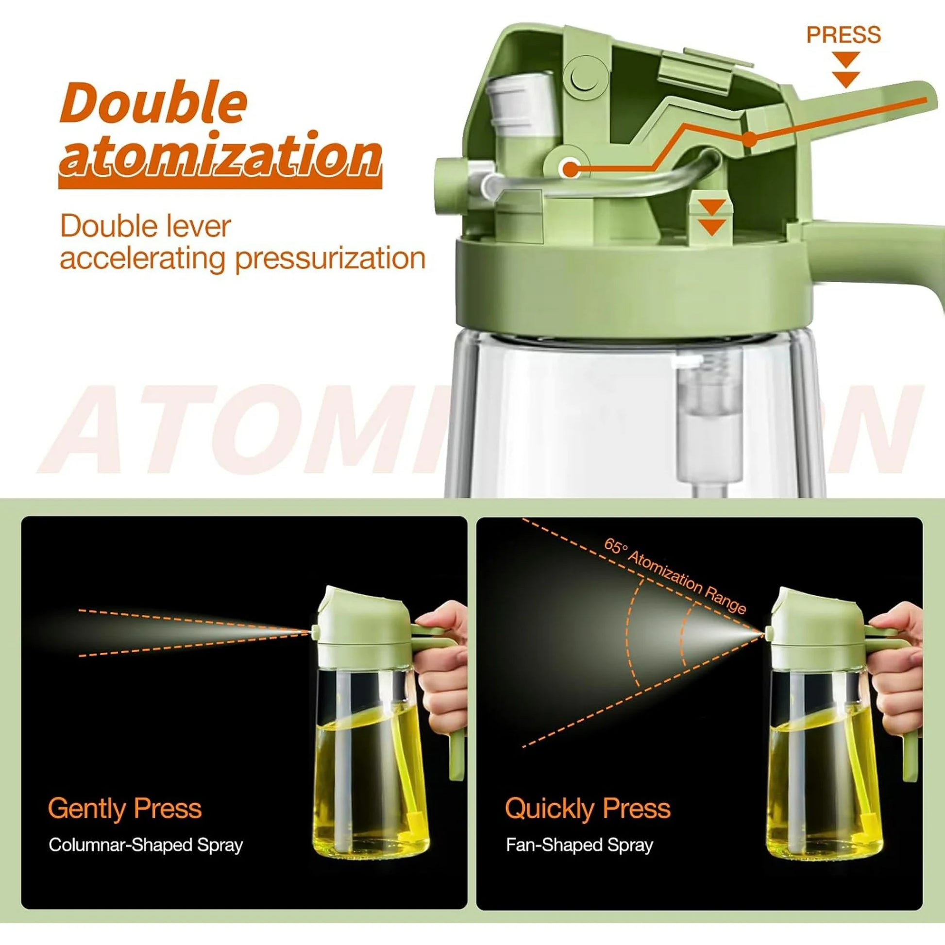 - Olive oil spray bottle is designed with the front-facing, prominent nozzle and the rear comfortable handle design enables users to achieve a fine, uniform, pure mist, users can pour or spray oil without getting their hands dirty