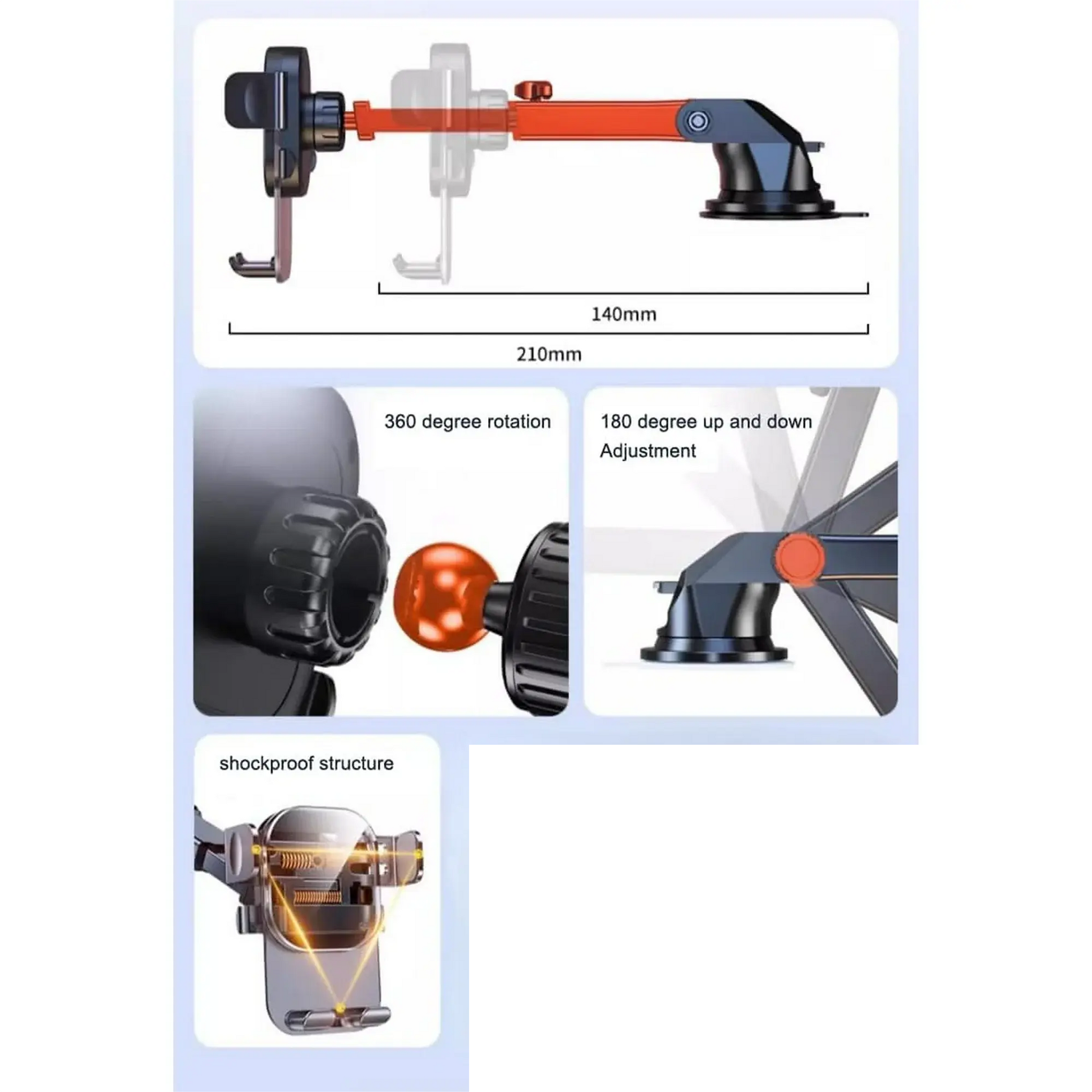 - Phone car mount features flexible adjustments. It features a 360-degree swivel ball joint and a 270-degree retractable arm, allowing you to easily adjust the angle of your phone without blocking your view! The telescoping arm extends from 4.5 inches to 6.5 inches and rotates up and down for unlimited viewing angles. it keeps your phone always in view and ready for any hands free calls, GPS navigation & music streaming.