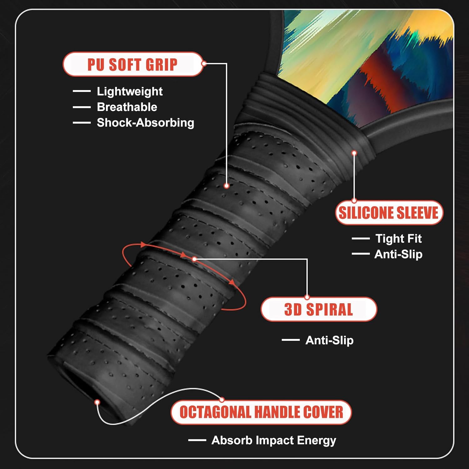 - The pickleball rackets designed with a soft grip handle and sweat-absorbing ventilation holes, ergonomic grip for prolonged gameplay comfort and traction, minimizing slippage and enabling fluid wrist action and agile rotation.
