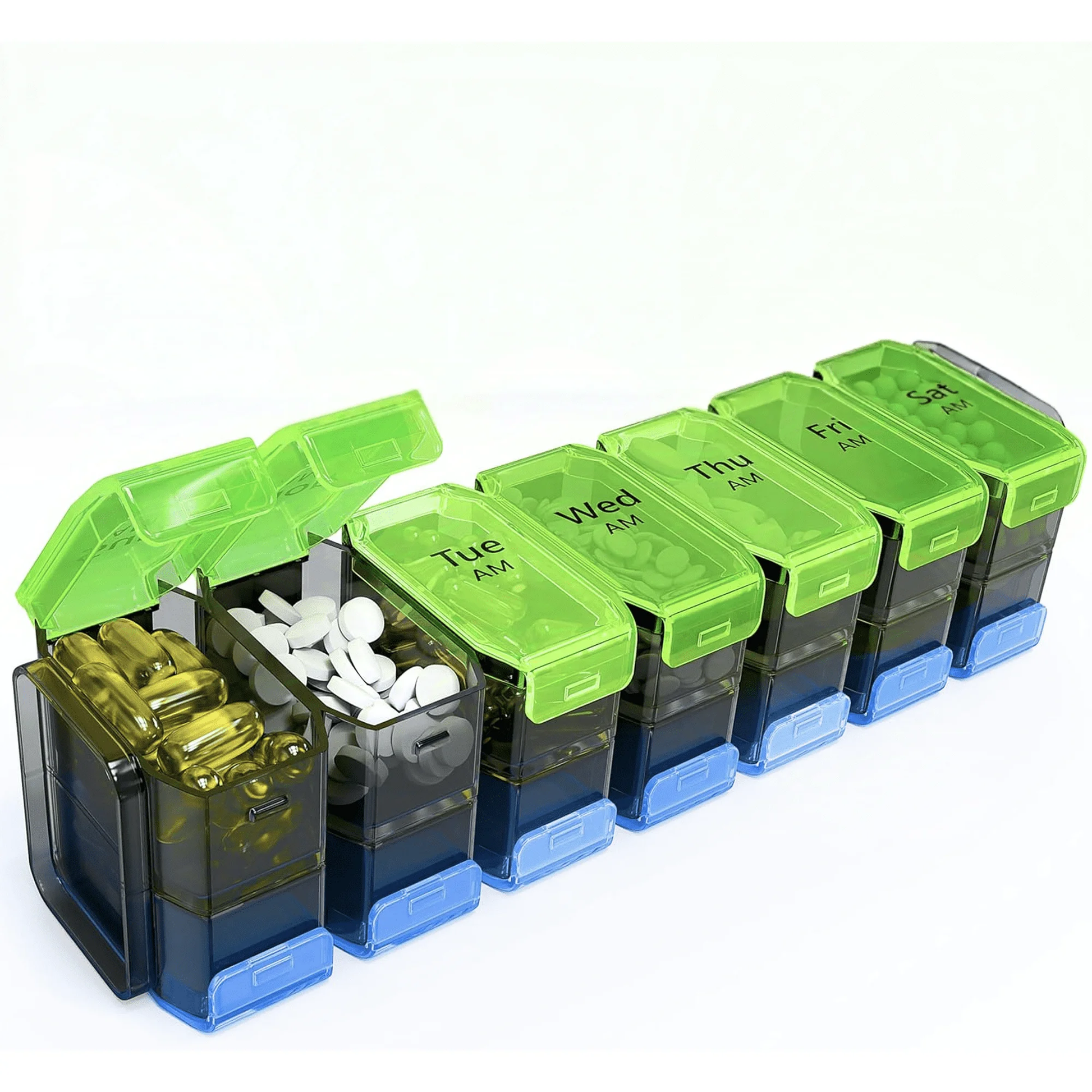 - This XL pill case features a double-sided design for efficient pill storage, saving space. It separates morning and evening doses for convenience and efficiency.